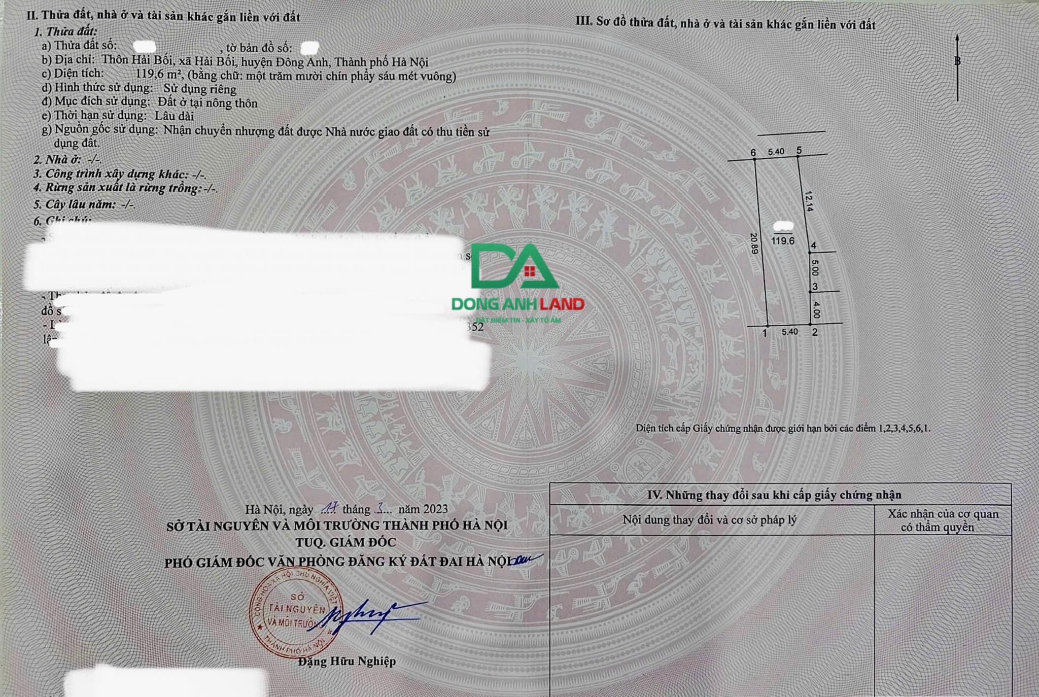Bán 119,6m2 đất xã Hải Bối Đông Anh giá 5xtr/m2 - Giao dịch 24/7