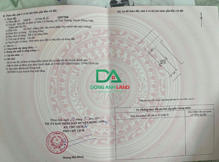 Bán đất tái định cư Bộ Công An Cổ Dương, Tiên Dương, Đông Anh – Lô sẻ khe, vị trí đẹp, hạ tầng đẹp (LK5-9)