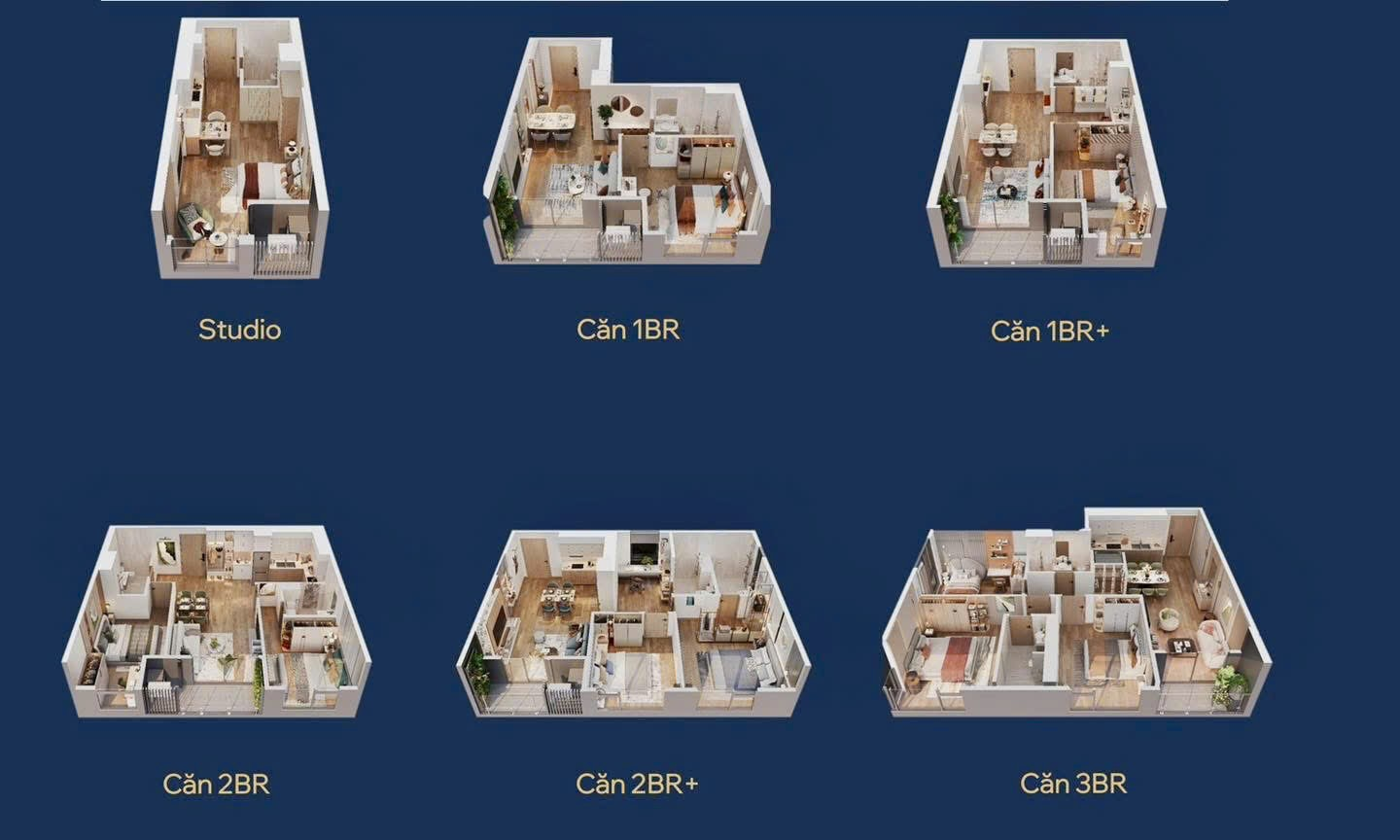 Diện tích: 68m² – 120m², thiết kế từ 2 đến 3 phòng ngủ.