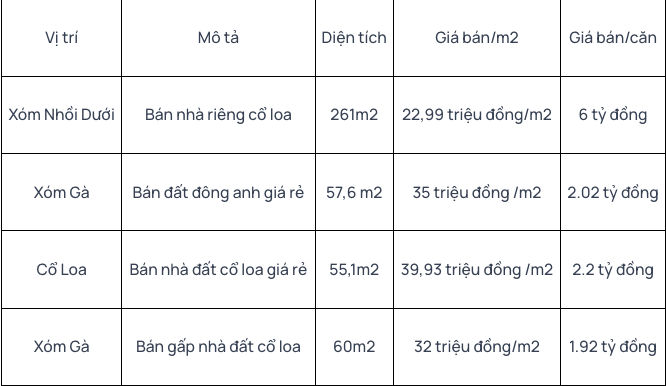 DongAnhLand đã cập nhật giúp bạn về giá bán nhà đất tại xã Cổ Loa, huyện Đông Anh qua bài viết này. Hy vọng những thông tin này sẽ giúp bạn có cái nhìn tổng quan và đưa ra quyết định phù hợp.